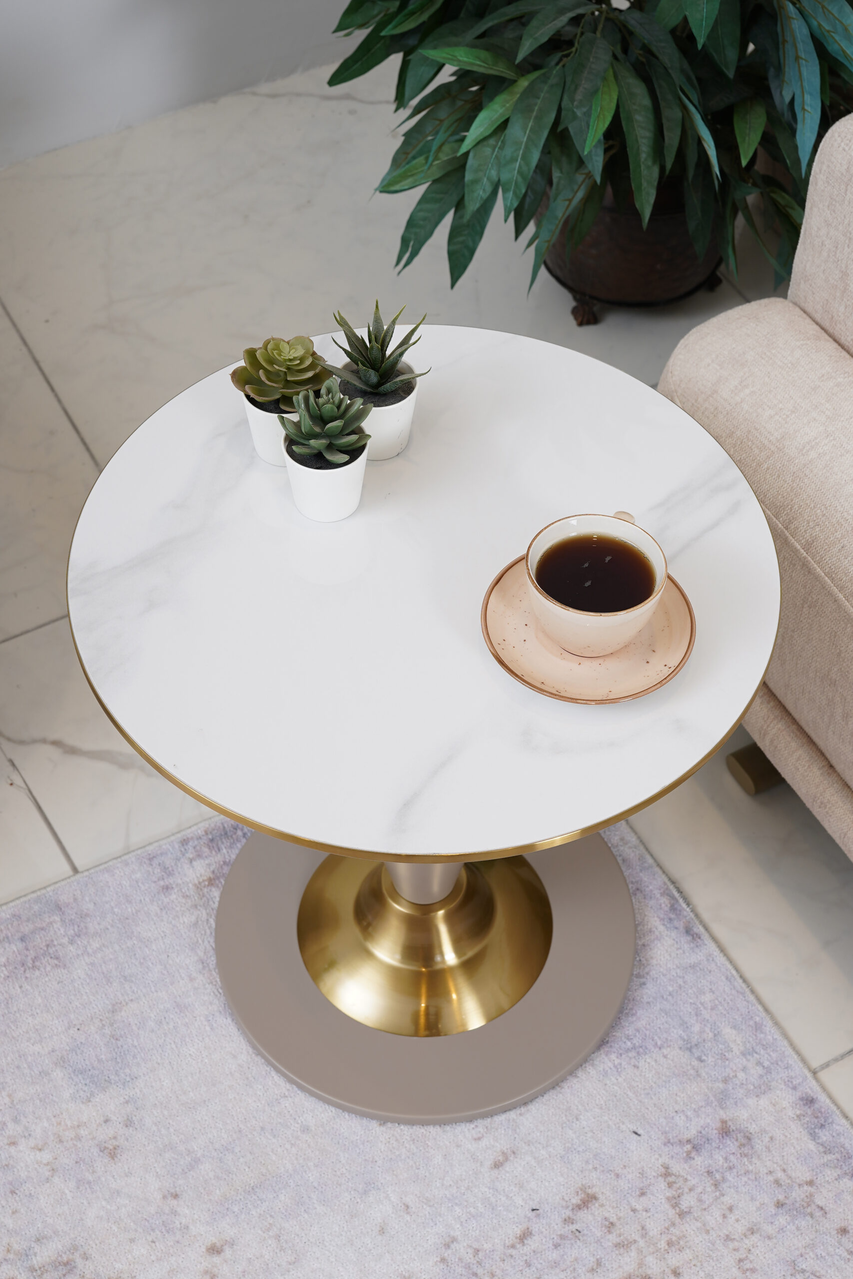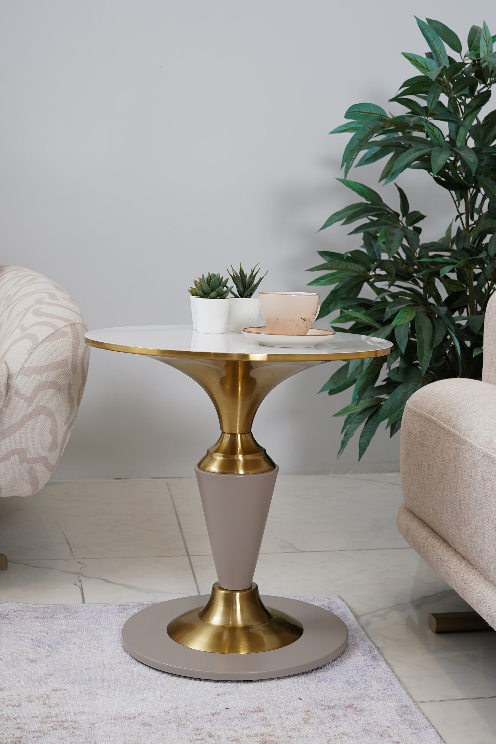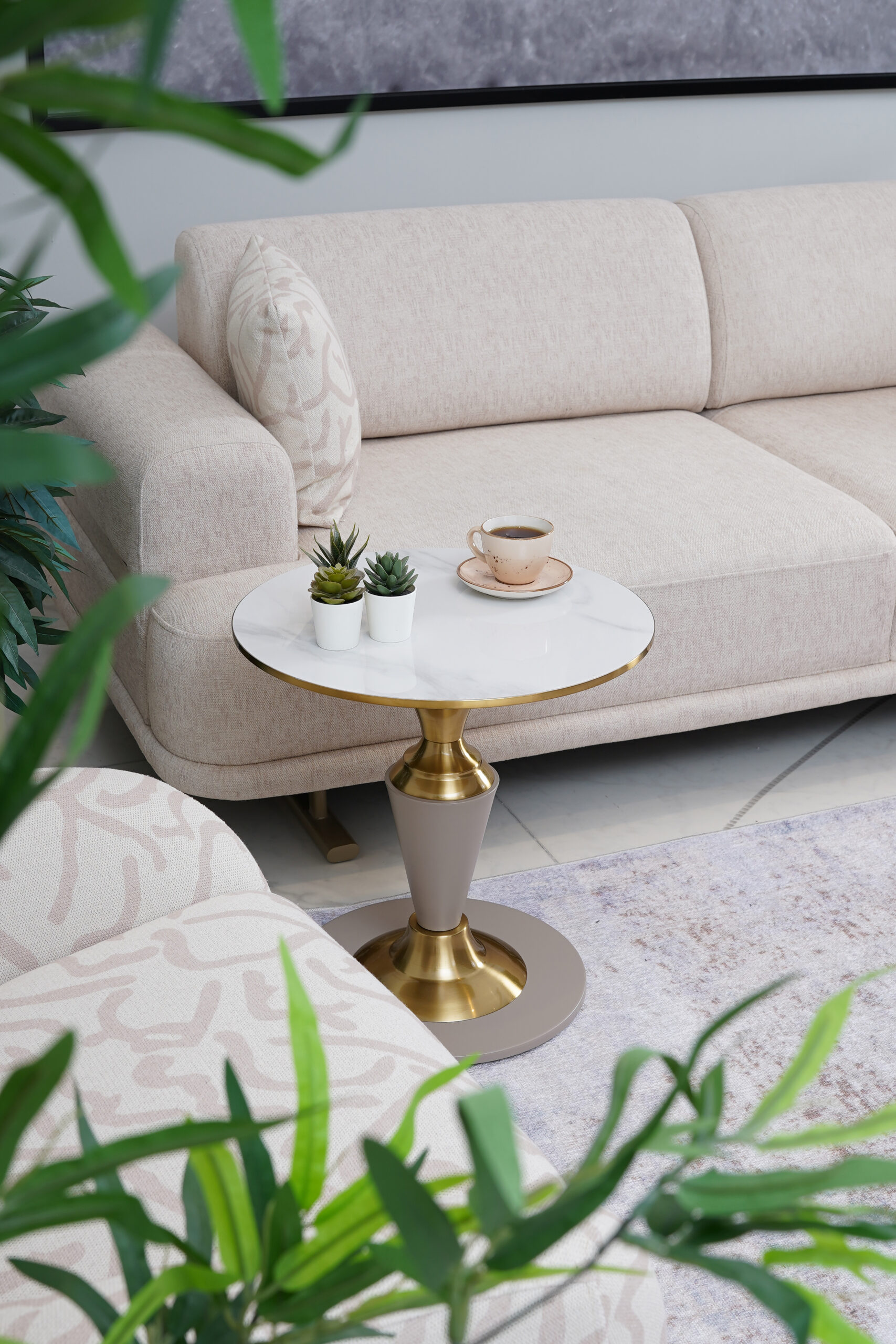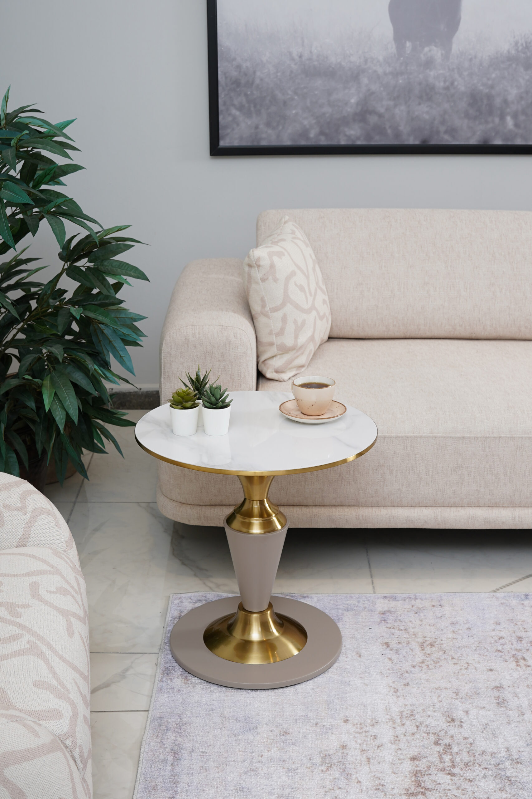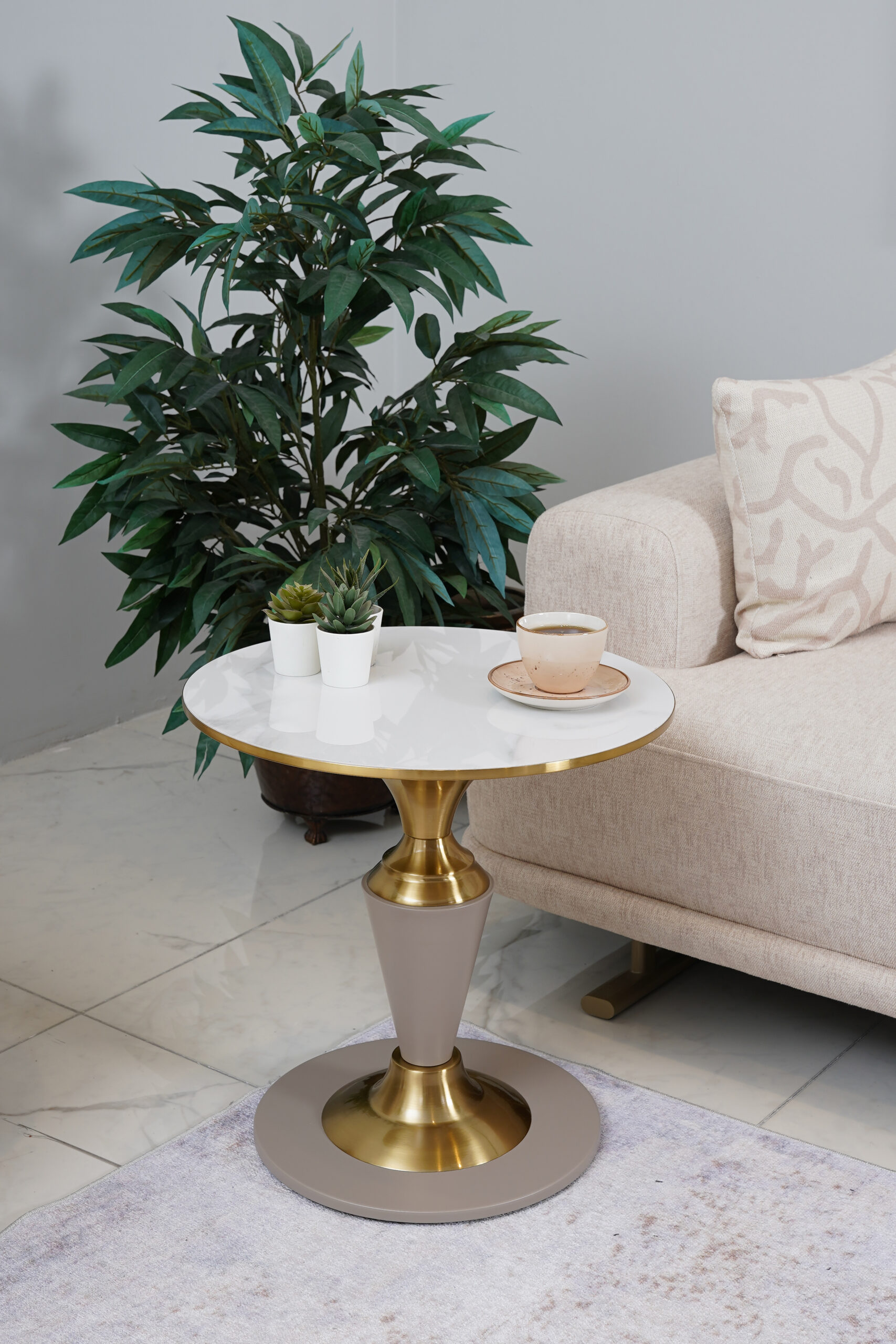 Bu şık ve lüks yan sehpa, krem ve altın tonlarının asil uyumuyla yaşam alanınıza ferah ve sofistike bir atmosfer katıyor.