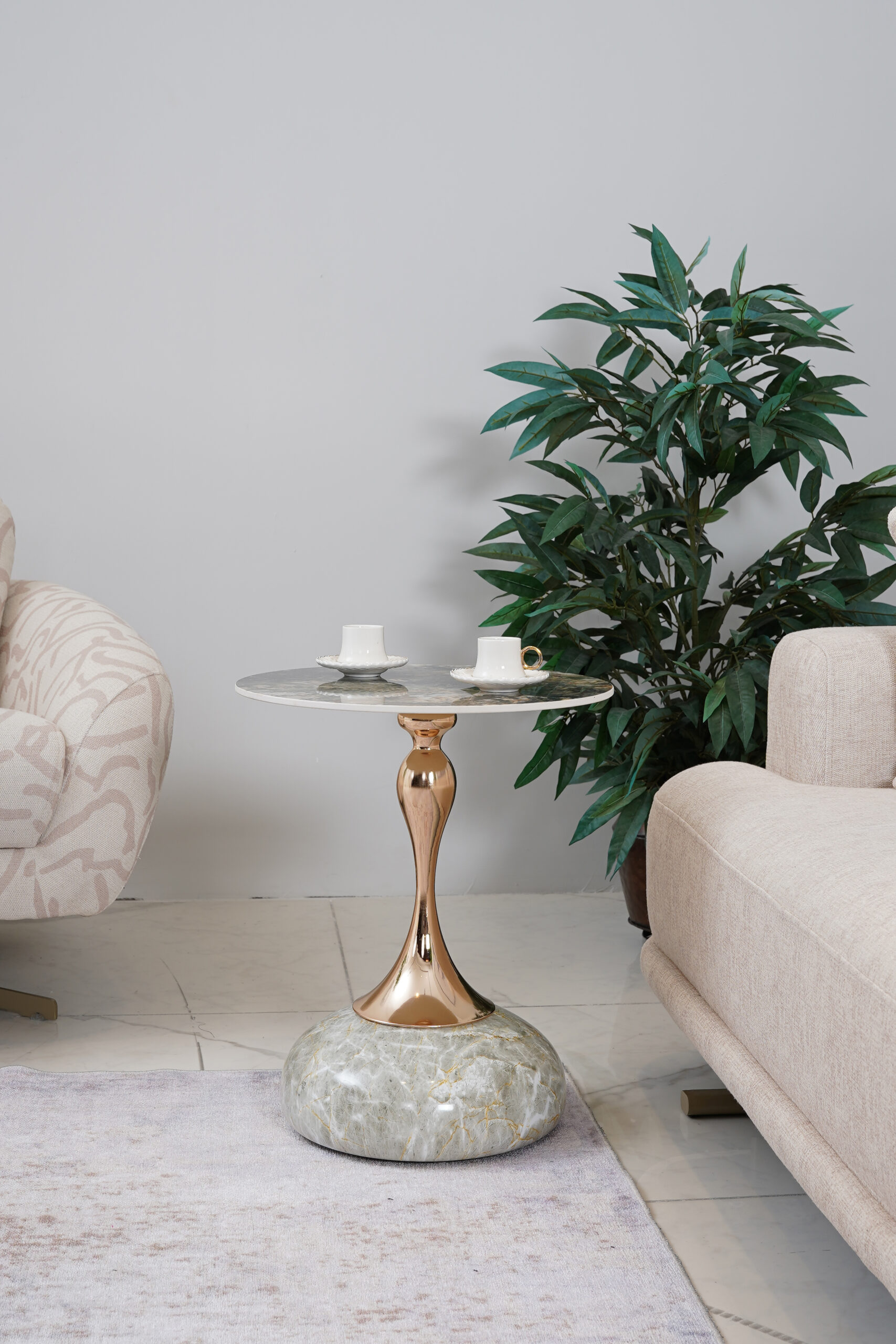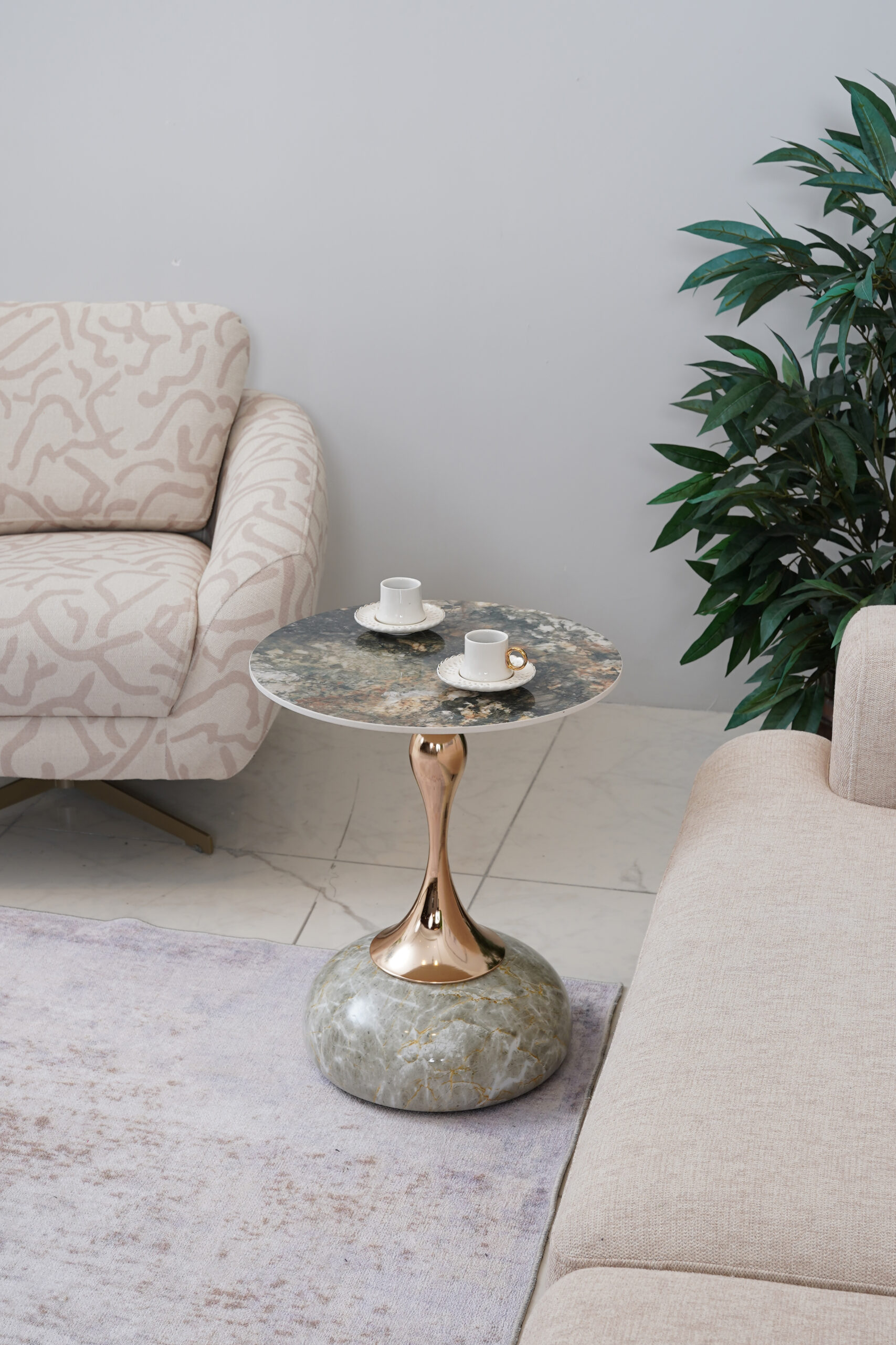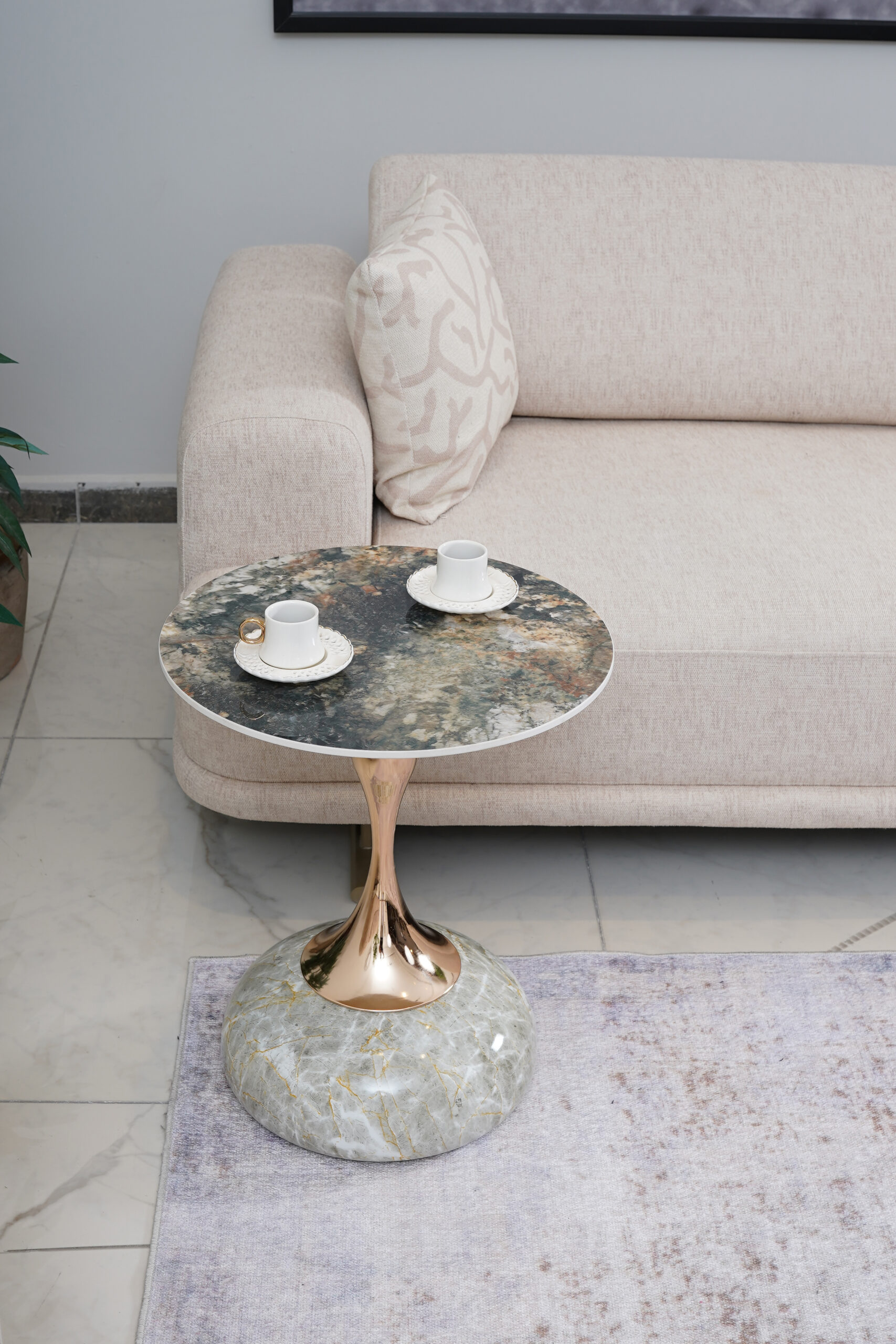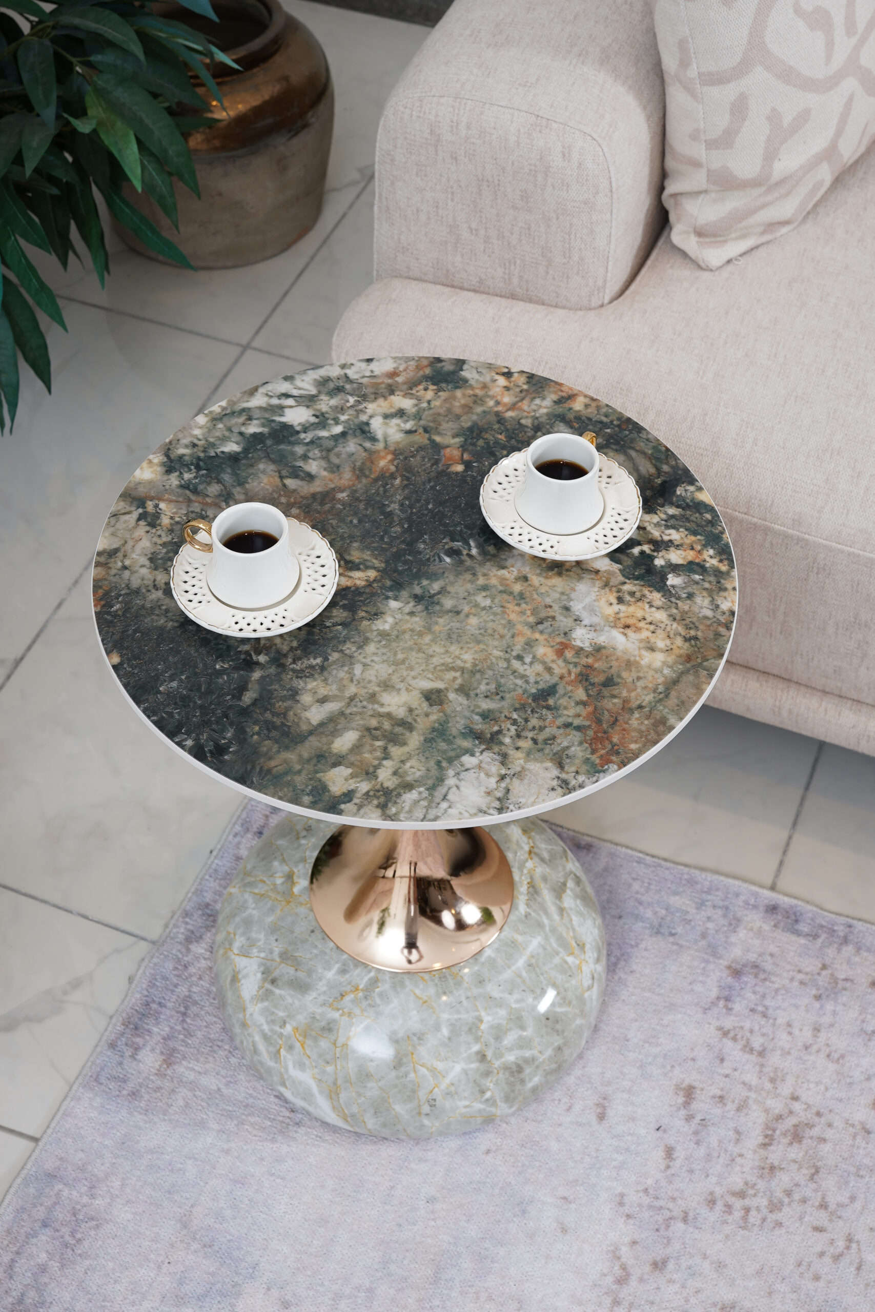 Bu benzersiz tasarım sehpası, doğal mermer dokularını sıcak metal detaylarla birleştirerek yaşam alanınıza adeta bir sanat eseri katıyor.